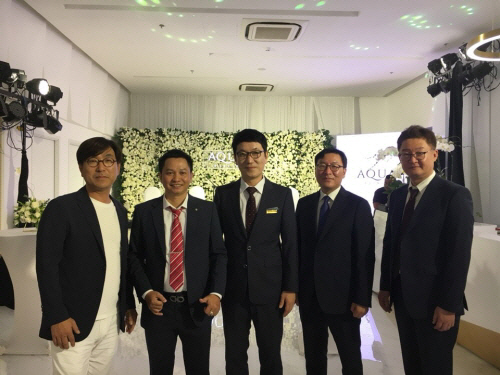 ▲ (왼쪽부터) 김재영 제테마 대표, 러이 시맥스 사이공 대표, 민경식 베트남 아쿠아클리닉 원장, 이상섭 제테마 해외영업팀장, 심정 시맥스글로벌 대표가 기념사진을 찍고 있다. [사진 제공 = 제테마]