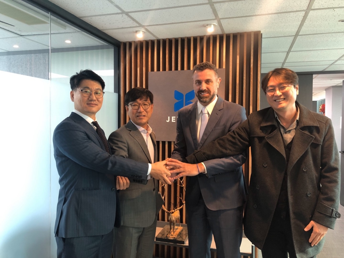 ▲ (왼쪽부터) ㈜펀샤인 설성문 대표, (주)제테마 김재영 대표, 브라질 독점 유통 업체 대표가 기념사진을 찍고 있다. [사진 제공 : (주)제테마]
